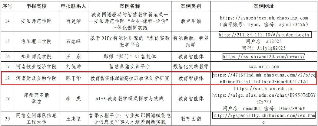 近日,河南省教育厅办公室公布了2025年度河南省“人工智能+高等教育”典型应用场景案例认定名单,我校tyc86太阳集团陈于华老师作为联系人申报的《教育智能体赋能思政课建设创新研究》项目获批2025年度河南省“人工智能+高等教育”典型应用场景案例。